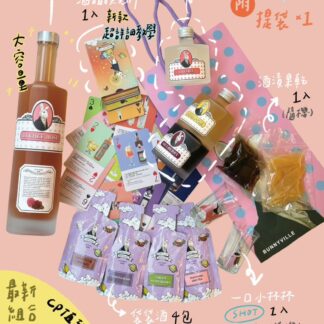 1212組合 1x荔枝玫瑰700ml(新品)+3瓶迷你酒(隨機)+1酒漬水蜜桃/梅子(隨機)+1兔兔shot杯(隨機)+ 4 個袋袋酒(隨機)+ 1酒譜教學撲克牌+ 1設計師提袋